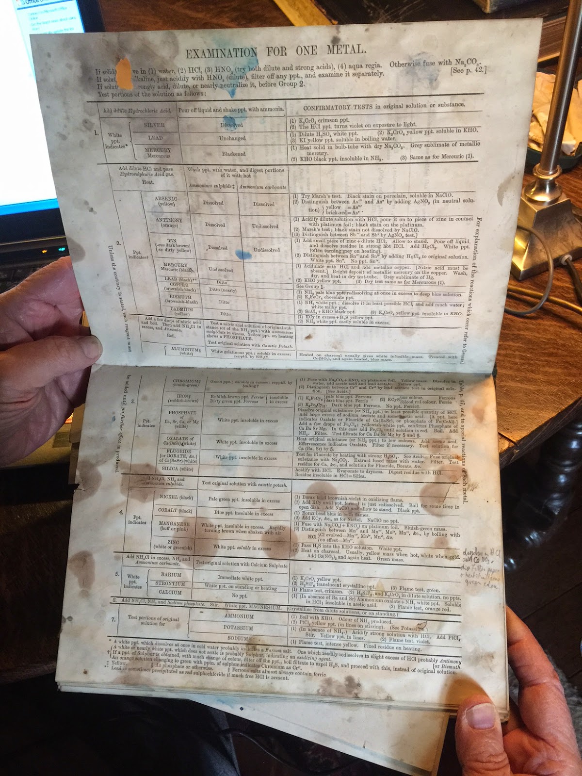 Another view of the book, entitled Notes on Qualitative Analysis, with telling marks of a book well used.